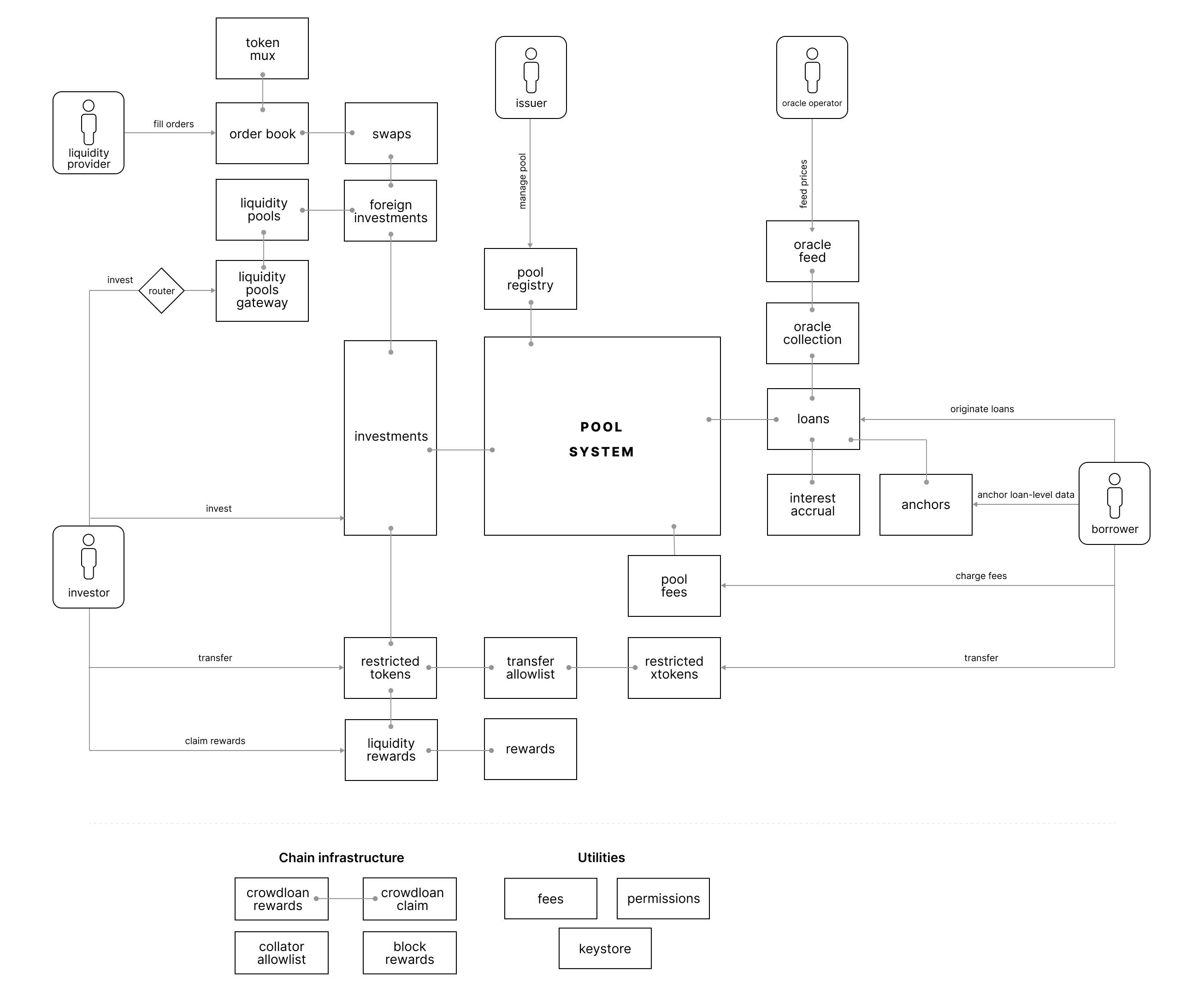 The Centrifuge Chain functionality is grouped in 4 key groups of modules (also known as pallets). pool-system