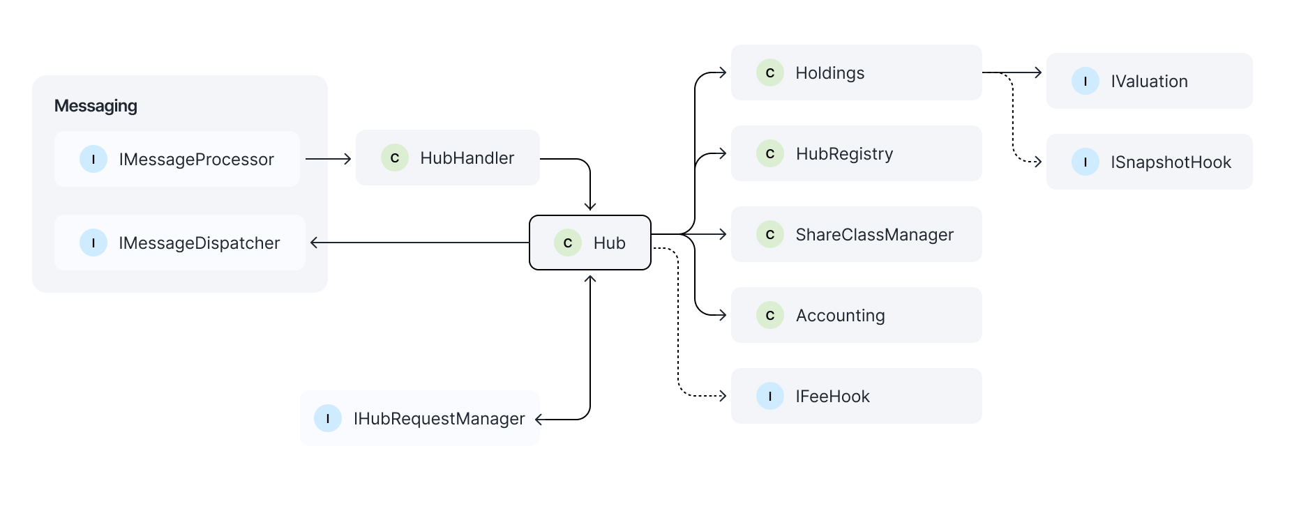 The central pool management contract that aggregates all core pool functions in a single interface. It handles pool administration including manager assignment, share class notifications, metadata updates, and asset price broadcasting across chains. Managers assigned to a pool have full rights over all pool actions, enabling them to configure holdings, update share classes, set price feeds, and coordinate cross-chain state synchronization.
