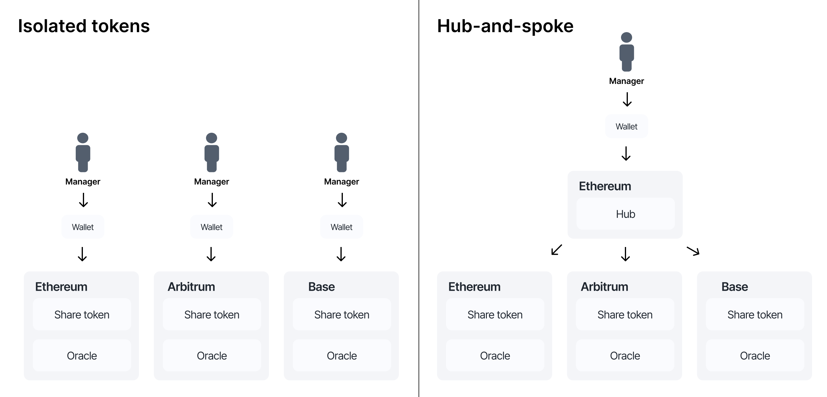 In legacy designs, each token is issued on each network, fully isolated. That means if a pool wants to make its asset available across Ethereum, Base, and Arbitrum, it must issue three separate tokens - one on each chain. Each version of the token has to be deployed, managed, and reconciled separately.