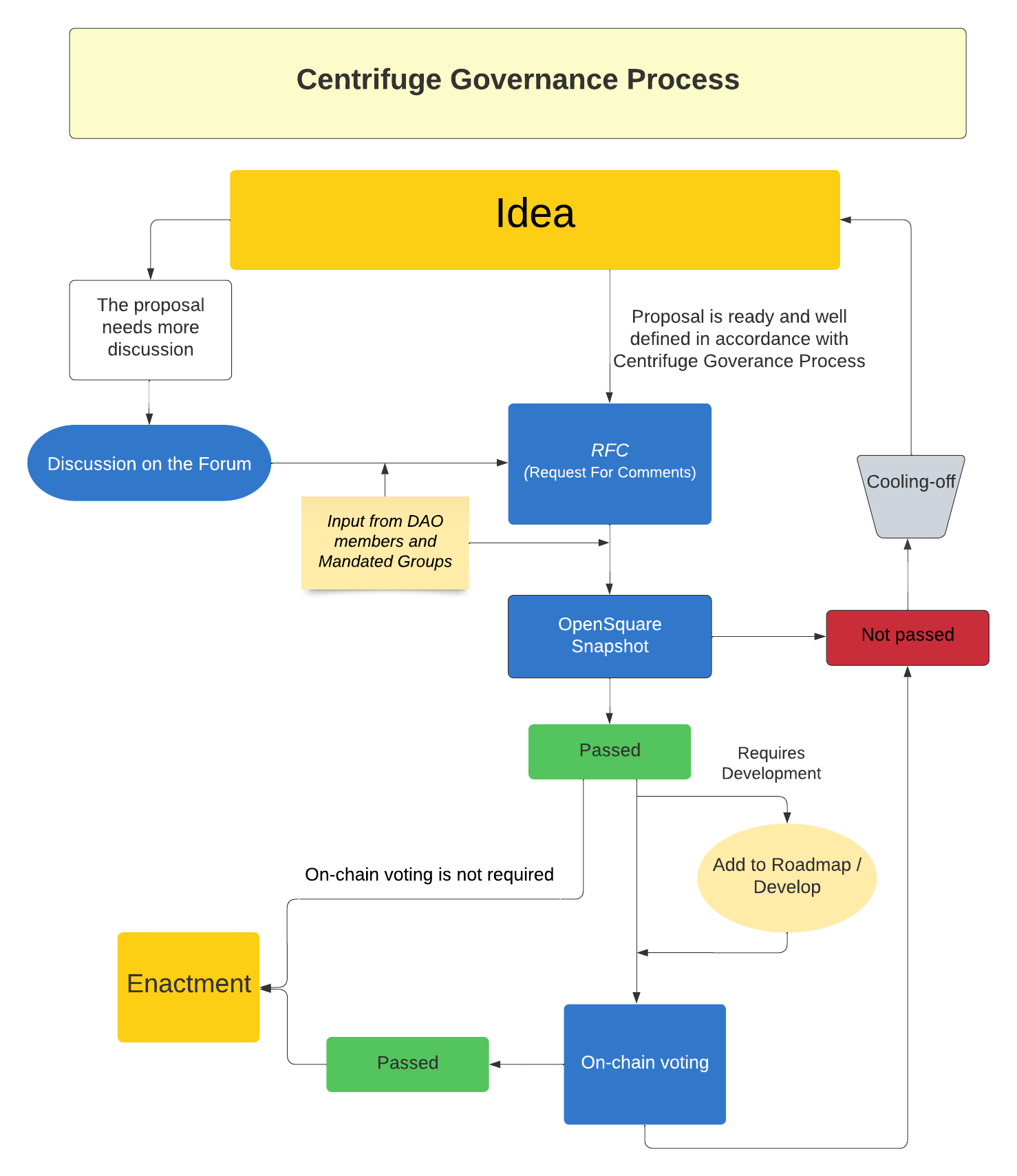 Components can have different governance processes, but what they all have in common is that they start with a post on the Forum and all CPs must be submitted to the Centrifuge Proposals Repository on Github. Click on the link for a component above to see its correct process and template, including a standard header that is used in all forum posts.