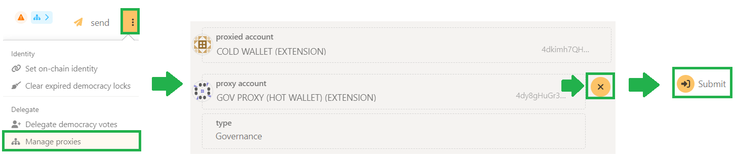 To remove a proxy, go to the Accounts section of the portal, find the wallet that created the proxy (use same steps as above to import it again if needed), click on the three dots next to it, select Manage proxies, click on the X next to the proxy you want to remove, click Submit and sign the transaction.