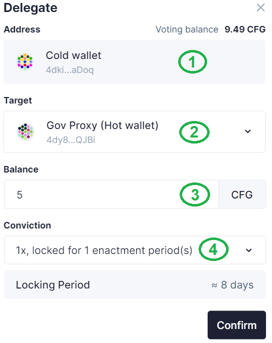 - Select the wallet you are delegating to (select from the list or paste the CFG address)