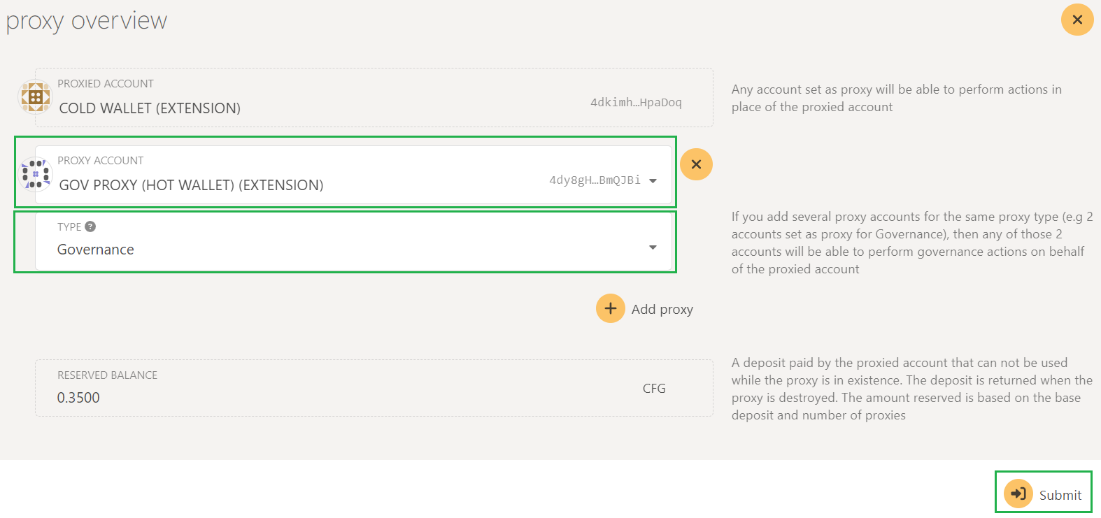 It is very important that you select Governance under 2. and not any of the other options to ensure that the proxy wallet only can be used in Governance, and not to transfer tokens or anything else.